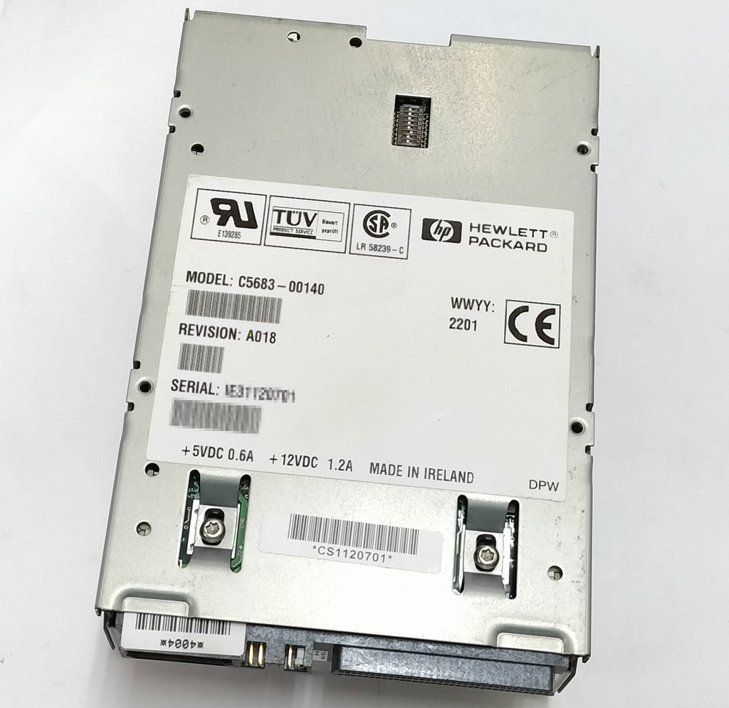 HP製、C5683A(C5683-00140) 内蔵型DDS4テープドライブです。 中古良品となります。 接続インターフェースは SCSI 68ピンです。 非圧縮時:20GB、圧縮時:40GBのバックアップが可能です。 WindowsXP + ARCserveにて、バックアップテストを行いました。 読み込み・書き込みの正常動作を確認しています。 外観は比較的キレイな状態ですが、ベゼルがありません。 細かい擦り傷等はありますのでご了承下さい。