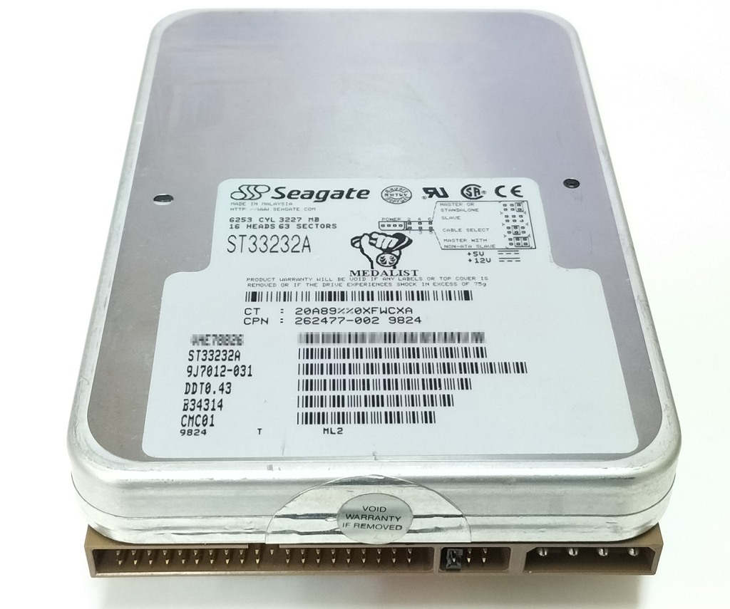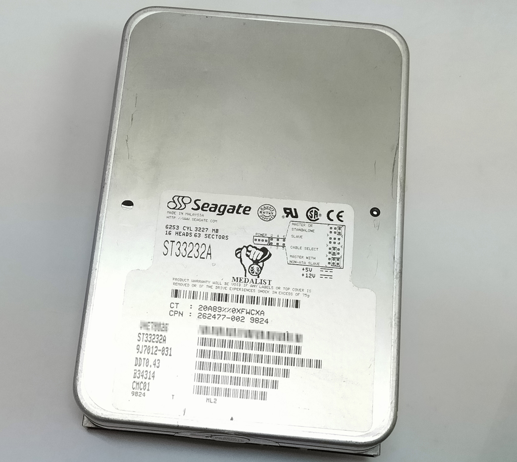 Seagate製のハードディスク、Medalist 3232 ST33232A です。 詳しい仕様は表のとおりです。 動作確認を行ったところ、HDD SCAN V2.0 により不良セクタ498をか確認しています。フォーマットはできませんでした。 部品取りなどにどうぞ。 写真は流用していますので、細かなシリアルナンバーなどは実物とは異なる場合があります。ご了承ください。
