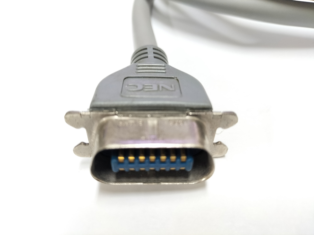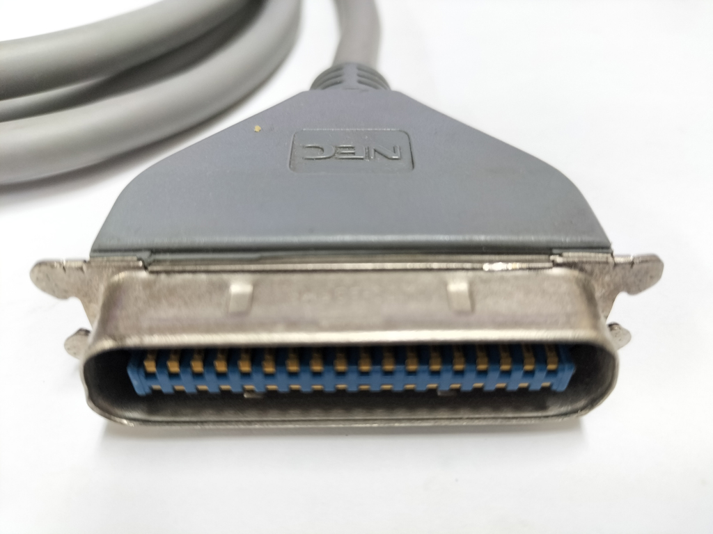 NECのPC-9800シリーズ用の純正プリンタケーブルです。 パソコン本体側のコネクタは、アンフェノールフルピッチ14pinです。 プリンタ側のコネクタはアンフェノールフルピッチ36pinです。 PC-9800シリーズ以外にも、PC-6000シリーズ、PC-6600シリーズ、PC-8000シリーズ、PC-8800シリーズにも使えます。 最初期のプリンタケーブルで、データはパソコン本体からプリンタに対して一方方向で通信します。 後の時代にMicrosoft Windows Printing Systemが登場し、プリンタポートの双方向通信が必要になり、パソコン本体側のプリンタポートもアンフェノールハーフピッチ36pinになりました。 この14pinタイプのプリンタケーブルはそれ以前の規格のプリンタケーブルになります。